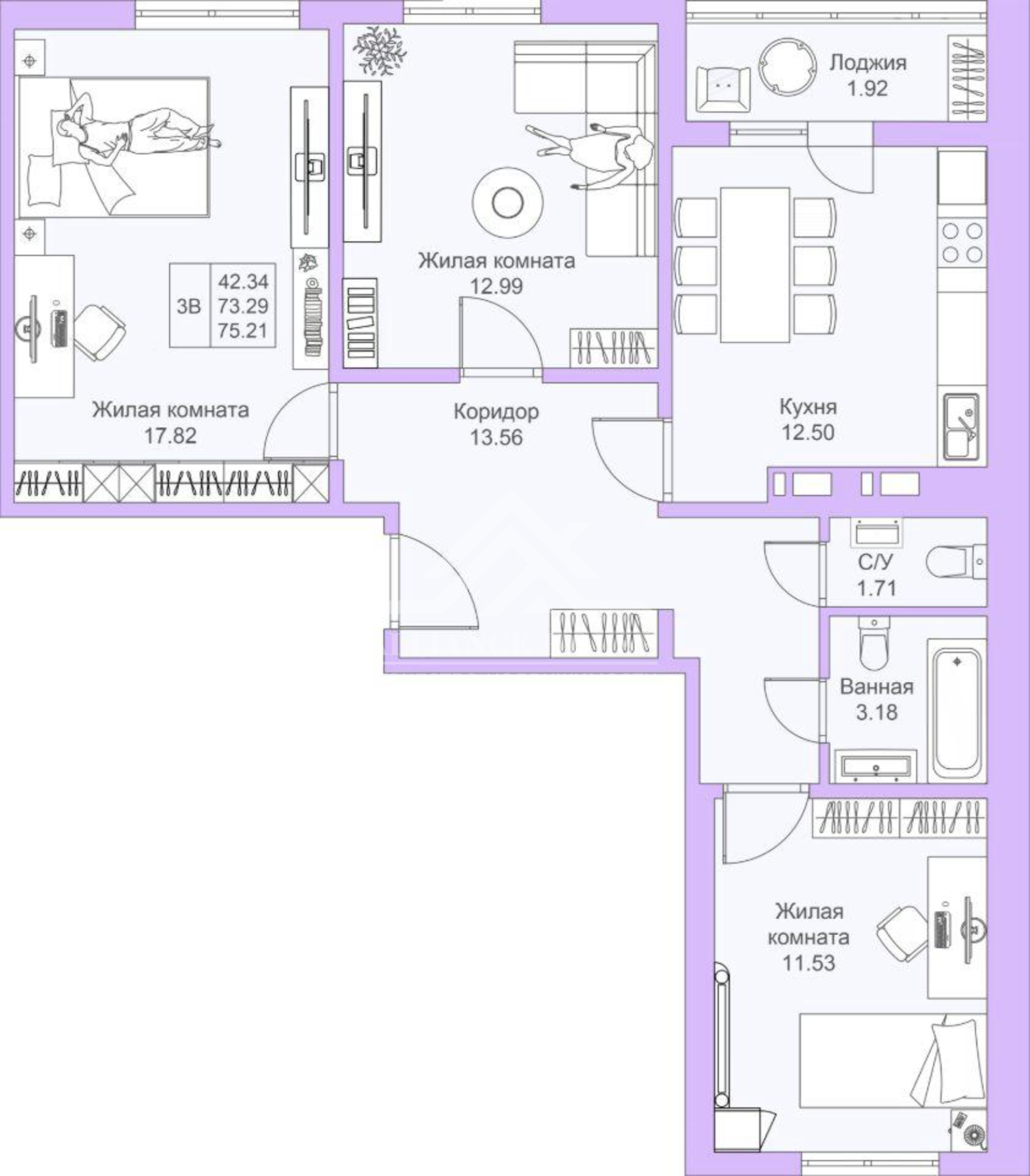 ➖ Общая площадь 73 м² (с учетом лоджии)